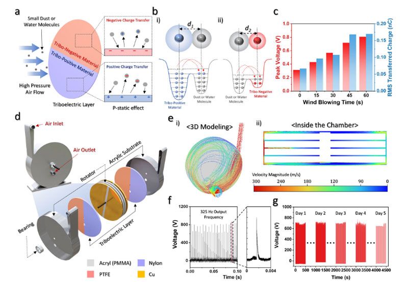 Основой установки стала структура, представленная Николой Теслой ещё в начале прошлого века: рабочая среда — сжатый воздух — приводит в движение пакеты дисков, между которыми создаются заряды на трибонегативных и трибопозитивных слоях. Воздушный поток вызывает вращение дисков турбины без механического трения с их поверхностями, а возникающие электрические заряды индуцируют электростатическое напряжение на электродах ротора. Такой принцип позволяет устройству работать как контактно-независимый трибоэлектрический генератор, но с гораздо более высокой частотой выходного напряжения по сравнению с обычными трибоэлектрическими наногенераторами.