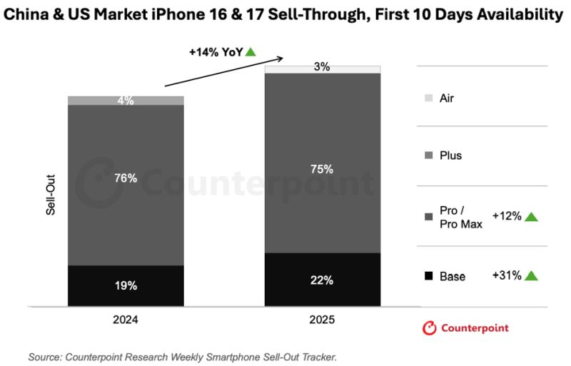 Авторы исследования сравнивают iPhone Air с прошлогодним iPhone 16 Plus, и по структуре спроса они действительно похожи, поскольку в прошлом году на второй приходилось 4 % продаж Apple в США и Китае, а в текущем первые десять дней реализации показали концентрацию до 3 % покупок именно на iPhone Air. В Китае интерес к модели на первых порах сдерживался отсутствием условий для работы eSIM, но теперь ситуация разрешилась, и некоторые источники говорят о высокой популярности iPhone Air в регионе. В целом, iPhone Air оказался более востребованным, чем iPhone 16 Plus.