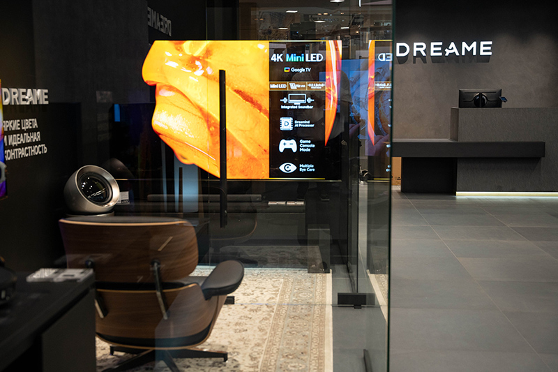 В новом магазине впервые представлен расширенный ассортимент продуктов Dreame, включая новую категорию — телевизоры с максимальной диагональю в 100 дюймов. Главной особенностью магазина являются специальные зоны. В частности, для демонстрации телевизоров выделено отдельное помещение с живым звуком, что позволяет ощутить эффект полного погружения в сцену. Также есть зона с газонокосилкой, оформленная как элемент сада с фито-стеной и газоном, что позволило воспроизвести естественную атмосферу и продемонстрировать возможности новой техники для дома и сада.