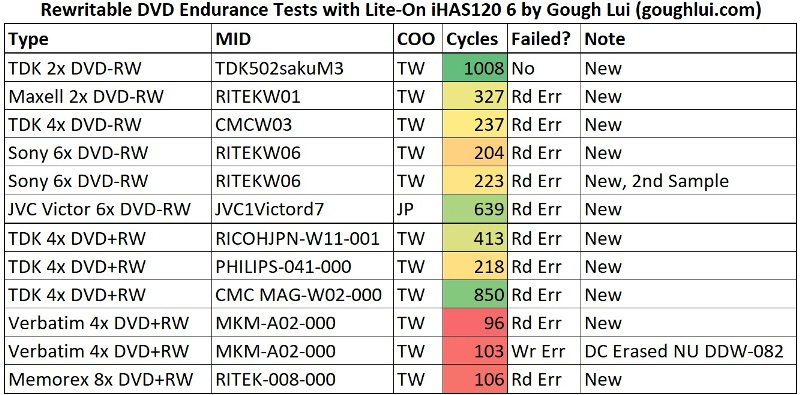 Техноэнтузиаст доктор Гоф Луи (Dr. Gough Lui) поделился своими выводами о долговечности перезаписываемых дисков DVD, к которым он пришёл после шестимесячного тестирования продукции разных производителей. В своём блоге он подробно описал методологию тестирования и подвёл его итоги. Лучший результат показал DVD-RW-диск бренда TDK, но они уже не выпускаются серийно.