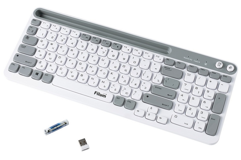 Подключение к компьютеру или другим устройствам осуществляется либо по Bluetooth, либо с помощью USB-приёмника по радиоканалу в диапазоне 2,4 ГГц. Это позволяет использовать одну клавиатуру сразу с двумя устройствами. Питание обеспечивается одной батарейкой формата AAA, заряда которой, по заявлению Filum, хватает на 4–6 месяцев работы.