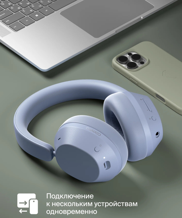 В модели Commo One 2.0 доступны два режима звучания: стандартный и басовый. Первый подходит для прослушивания подкастов, видео и повседневного использования, второй — для тех, кто предпочитает насыщенный звук с глубокой отдачей низких частот. Для переключения режима необходимо зажать кнопку Play/Pause на четыре секунды. Благодаря функции Multipoint Connection наушники можно подключить сразу к двум устройствам — например, к ноутбуку и телефону.