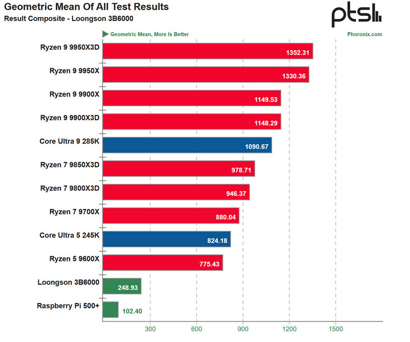 Китайский процессор Loongson 3B6000 оказался в среднем втрое медленнее AMD Ryzen 5 9600X