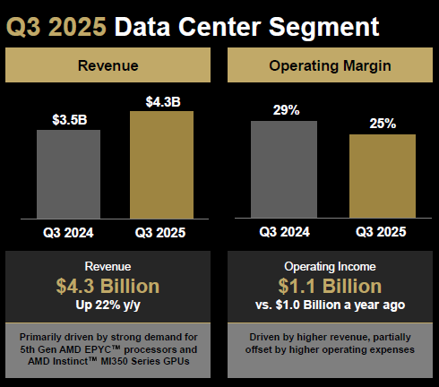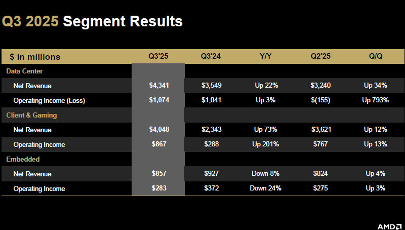 Серверный сегмент принёс AMD в прошлом квартале $4,3 млрд выручки, что на 22 % превышает прошлогодний результат и оказывается больше ожиданий аналитиков. Операционная прибыль компании в серверном сегменте достигла $1,07 млрд, тогда как кварталом ранее на этом направлении были получены операционные убытки в размере $155 млрд. В третьем квартале серверную выручку AMD толкали вверх не только поставки ускорителей Instinct MI350, но и центральные процессоры EPYC пятого поколения.