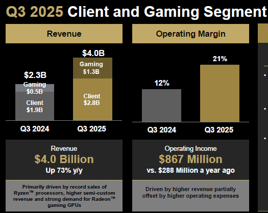 В клиентском и игровом сегменте, которые в отчётности компании объединены, выручка выросла в годовом сравнении на 73 % до $4,05 млрд, а операционная прибыль взлетела в три раза до $867 млн. Непосредственно в клиентском сегменте выручка выросла на 46,2 % до $2,75 млрд, а вот в игровом она выросла почти в три раза до $1,3 млрд. Это значительно выше тех $1,05 млрд, на которые рассчитывали аналитики. По словам Лизы Су, подобная динамика игровой выручки объясняется усилиями Microsoft и Sony по наращиванию объёмов выпуска своих игровых консолей в преддверии сезона праздничных распродаж. Глава AMD также отметила, что в дальнейшем сегмент ПК в плане выручки будет расти быстрее остального рынка. По данным Gartner, в третьем квартале мировой рынок ПК должен был вырасти на 8 %. В любом случае, рост выручки AMD в клиентском сегменте в третьем квартале был обусловлен и рекордными продажами процессоров Ryzen.
