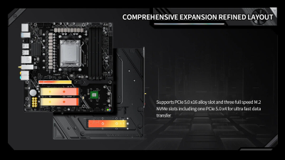 Несмотря на компактные размеры (плата выполнена в формате Micro-ATX), MS-iCraft X870M оснащена усиленной подсистемой питания VRM со схемой фаз 16+2+1, где каждая фаза рассчитана на силу тока 50 А. MaxSun заявляет целевой TDP в 300 Вт с возможностью «разблокировки» до 400 Вт, причём на рекламном слайде в качестве ориентира упоминается Ryzen 9 9950X3D. Иными словами, у платы есть большой запас по мощности для возможного разгона процессоров.