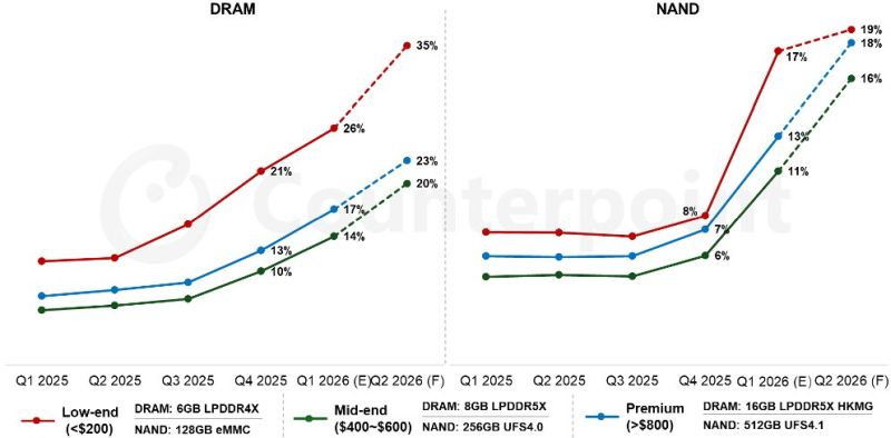 Закономерно, что по бюджетным устройствам рост цен на память ударит сильнее всего. Эксперты уже предрекают трудности производителям недорогих смартфонов и хромбуков. Специалисты Counterpoint Research определили, что по итогам текущего квартала расходы производителей недорогих смартфонов на закупку памяти вырастут на 25 % и достигнут 43 % от общих затрат на материалы.