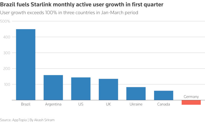 Рост абонентской базы обеспечивают как зрелые, так и развивающиеся рынки. Один из самых высоких темпов роста показала Бразилия, которая впятеро увеличила число активных пользователей в месяц по сравнению с предыдущим годом. Только на эту страну пришлись 13 % базы абонентов — годом ранее этот показатель был менее 5 %. В Аргентине рост числа пользователей составил 159 %. Вместе две эти страны представляют более пятой части всех активных абонентов Starlink в мире.