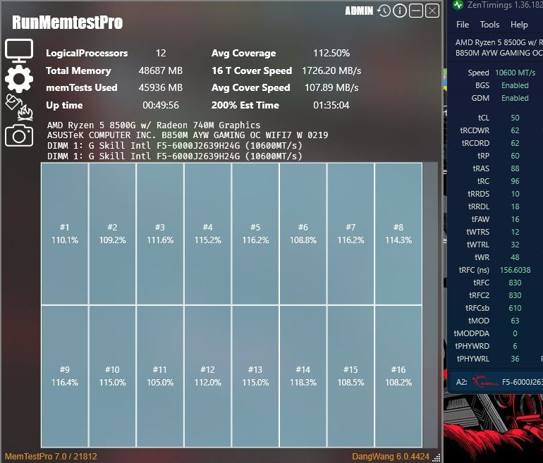 Тайваньский производитель модулей памяти G.Skill накануне сообщил о другом достижении. Специалистам по разгону удалось добиться стабильной работы пары модулей памяти объёмом по 24 Гбайт каждый в режиме DDR5-10600 при значении таймингов 50-62-60-88-96. Процессор AMD Ryzen 5 8500G со встроенной графикой при этом был установлен в материнскую плату Asus B850M-AYW, которую нельзя отнести к флагманским, всё ограничивалось стандартными воздушными средствами охлаждения. Более того, процессор сохранил активность всех шести ядер. G.Skill приводит и обозначение того комплекта памяти, который участвовал в эксперименте — это пара модулей DDR5-6000 объёмом по 24 Гбайт серии Trident Z5 Royal Neo. Указанные режимы работы памяти и конфигурация системы гораздо ближе к реальным условиям эксплуатации, чем эксперименты с жидким азотом. Более того, в режиме DDR5-10600 память и прочие компоненты системы проходят испытания в MemTest, а не просто позируют для скриншотов.