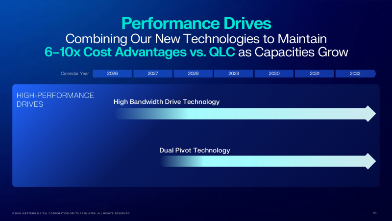В сочетании технологии High Bandwidth Drive и Dual Pivot позволят WD увеличить последовательную производительность ввода-вывода в четыре раза и позволят выпускать жёсткие диски ёмкостью 100 Тбайт при сохранении привычной для клиентов скорости на терабайт.
