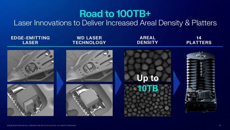 Western Digital долгое время изучала, как сделать лазерную головку в составе HDD максимально плоской, чтобы она помещалась между пластинами. В будущем компания планирует размещать в составе HDD стандартного формата 3,5 дюйма до 14 пластин и хочет достичь общей ёмкости в 140 Тбайт в таких решениях.