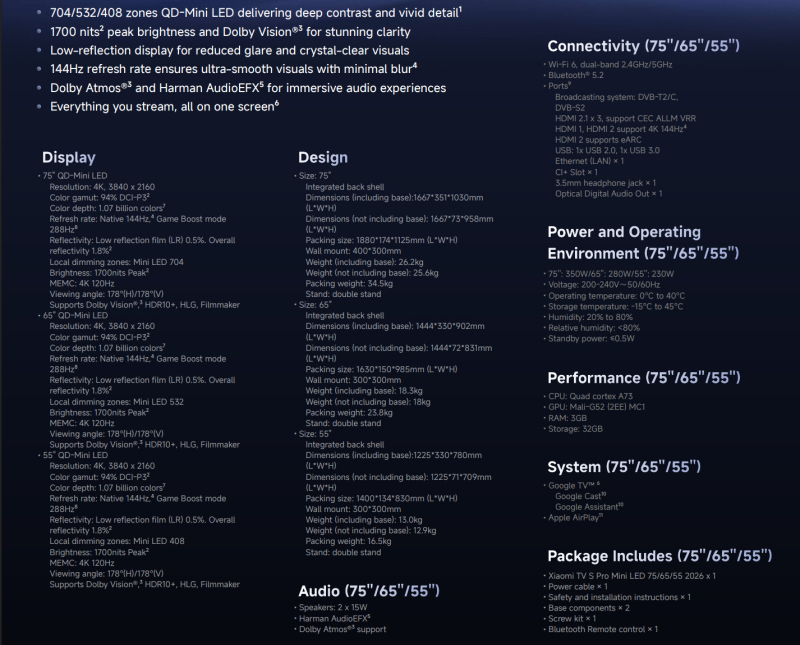 Для глобального рынка Xiaomi выпустила модели TV S Pro Mini LED Series 2026 с пиковой яркостью до 1700 кд/м². Панели китайских версий телевизоров предлагают до 1720 зон локального затемнения подсветки, а модели для международного рынка — до 704. При этом Xiaomi по-прежнему заявляет, что они обеспечивают «глубокую контрастность и яркую детализацию». В серию входят модели с диагональю экрана 55, 65 и 75 дюймов. Все поддерживают разрешение 3840 × 2160 пикселей.